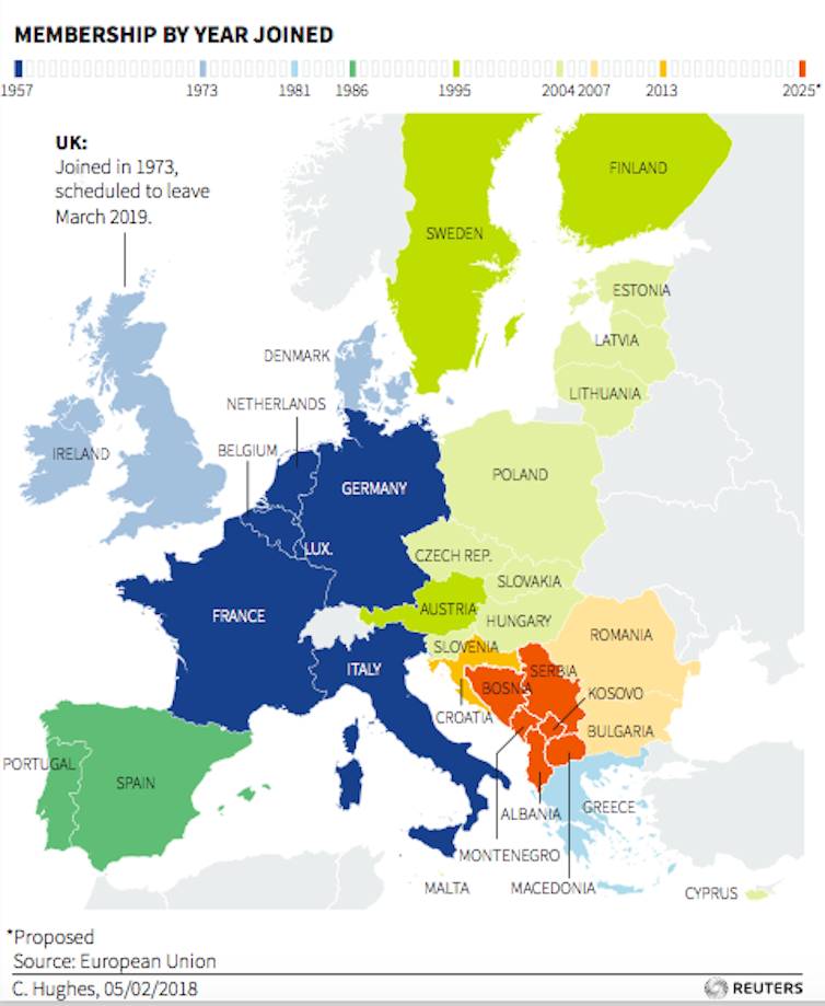 EUROPEAN UNION is an economic and political partnership of 28 European nations. It paves the way for a free market throughout Europe, i.e., both goods and people can travel anywhere within the EU member nations freely. Out of them 19 countries share a common currency EURO (some Partial members also run Euro and their own separate currency).